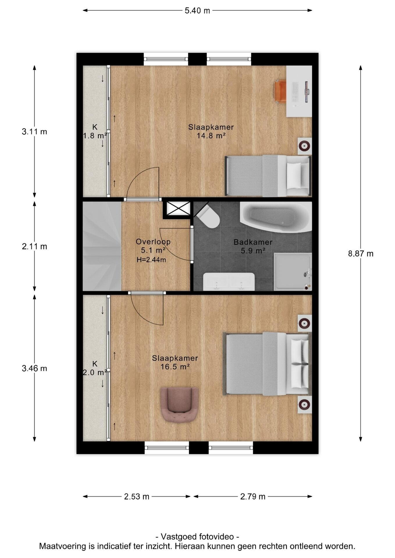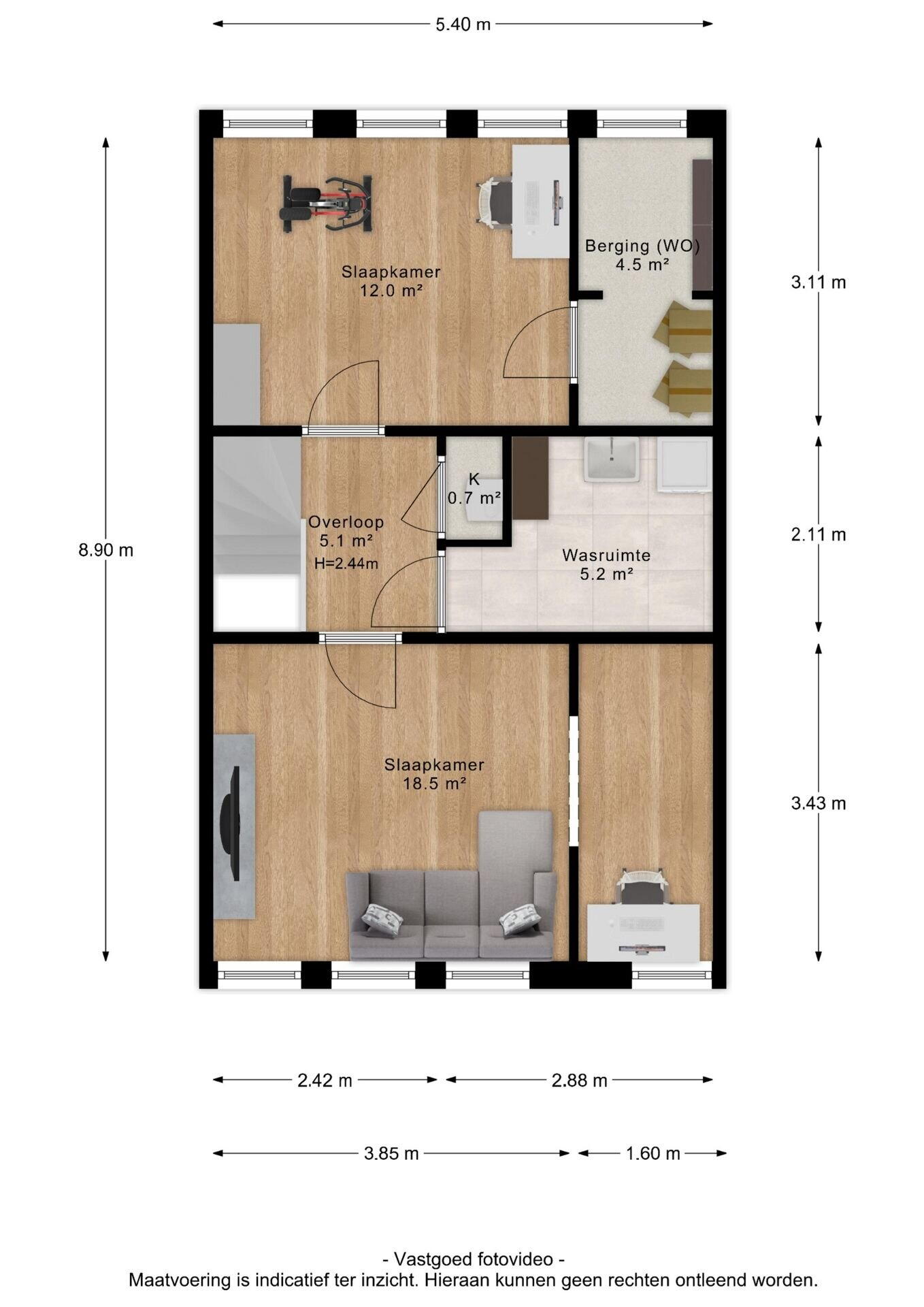 De tweede verdieping is te bereiken middels een vaste trap en biedt wederom verrassend veel ruimte. Hier bevinden zich nog eens twee vrijwel identiek grote slaapkamers van circa 19 m² en 12 m², waarmee de woning in totaal vier ruime en volwaardige slaapkamers telt. Daarnaast beschikt deze verdieping over een praktische berging van circa 5 m² en een aparte wasruimte van circa 5 m². Deze indeling maakt de verdieping uitermate geschikt voor grotere gezinnen, thuiswerkplekken en/of hobbyruimtes.